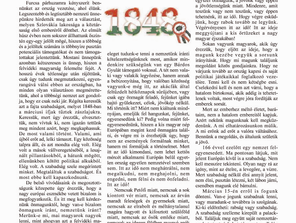 II. évfolyam 3. szám Közéleti havilap. Kiadja a Csemadok Nagykürtösi Területi Választmánya. Nyomda: Pekel Print s.r.o. Bratislava. Terjeszti: a Csemadok...