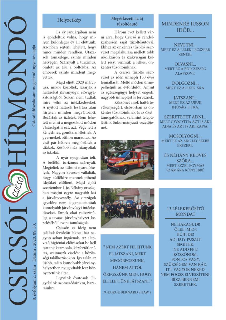 Csicsó időszakosan megjelenő ingyenes lapja, 8. évfolyam 2. szám, Dátum: 2020. 9. 30.