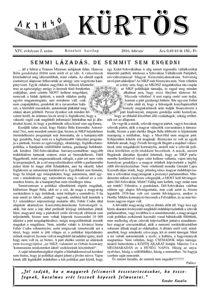 Közéleti havilap. Kiadja a Csemadok Nagykürtösi Területi Választmánya. Nyomda: Csemadok OV Veľký Krtíš. Terjeszti: a Csemadok Nagykürtösi Területi Választmánya. Ára 12.- korona, 0,40 €
