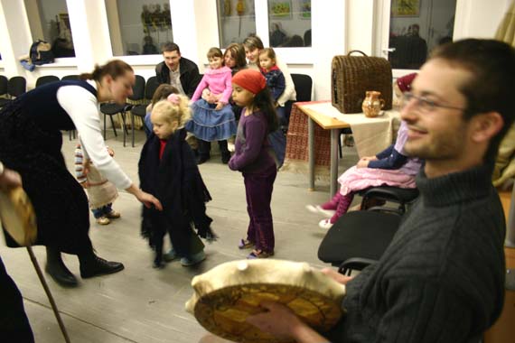 Méhes Gábor a sámándobon dobol, háttérben a táncoló gyerekek és Ölveczky MónikaBihari kör, Dunaszerdahely 2009-2010Létrehozó: Csemadok Művelődési IntézeteRead More