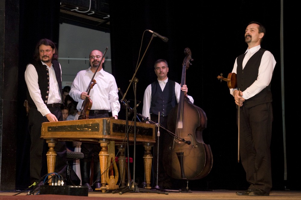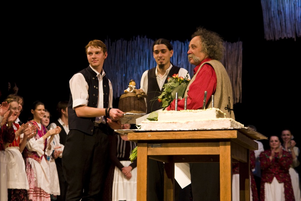 A jelenlegi tagok (Král Róbert és Mészáros Dániel) köszöntik az együttes vezetőjét, Brandl Ferencet.Létrehozó: Csemadok Művelődési Intézete