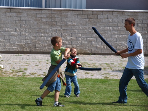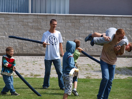 A fiúk „nekigyürkőznek” a kiállítás elkészítéséhez.