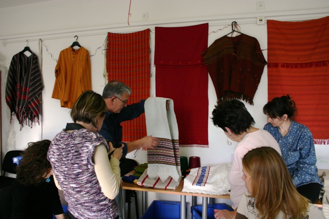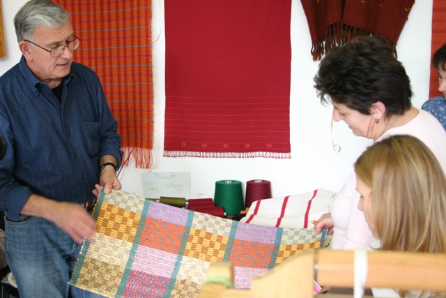 Lõrincz Péter szövõmester a régi és új szõttesekrõl mesél. A kép jobb oldalán Erzsébet és Veronika látható.Szövõtábor fiataloknak és felnõtteknekLétrehozó: Huszár Ágnes