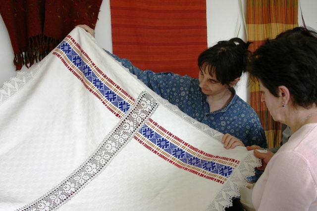 Nagy Mária egy régebbi szőttes díszítését mutatja.Szövõtábor fiataloknak és felnõtteknekLétrehozó: Huszár Ágnes