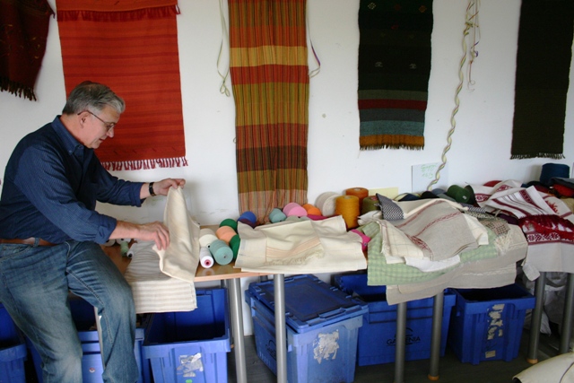 A kék ládákból kerültek elő a régi és új szőttesek, valamint a fonalak is. A képen Lőrincz Péter szövőmester látható.Szövõtábor fiataloknak és felnõtteknekLétrehozó: Huszár Ágnes