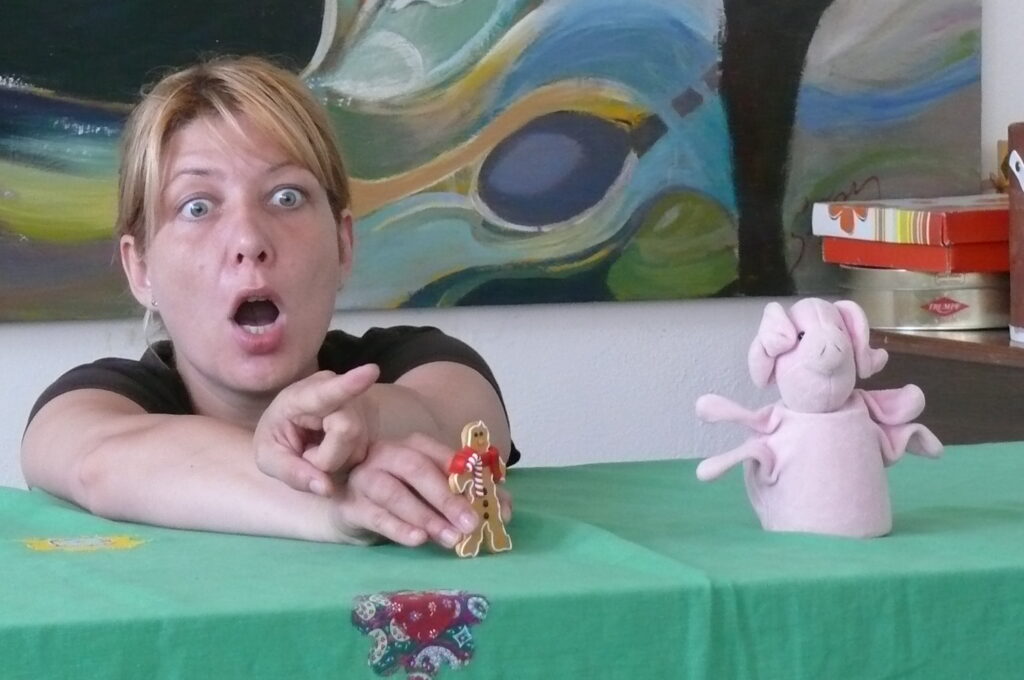Németh Luca bábszínész előadja A vajas Pánkó mesét.