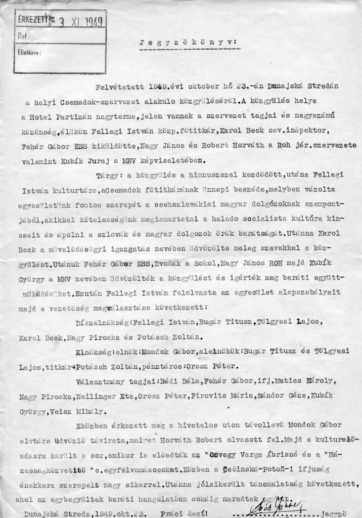 Párhuzamos cím: Varga László: Hatvanöt évvel ezelőtt történt, a Csemadok alapszervezeteinek megalakulása a dunaszerdahelyi járásban (1949-1953)