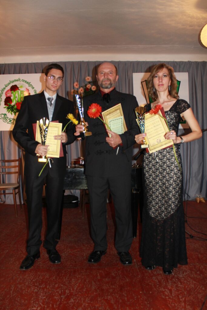Eredeti cím: A XVI. Őszirózsa Magyarnóta-énekesek Minősítő Versenyének első három helyezettje: (balról) Molnár Lóránt második, Tonkó István első, Jalsovszky Mónika harmadik díjat nyert el.