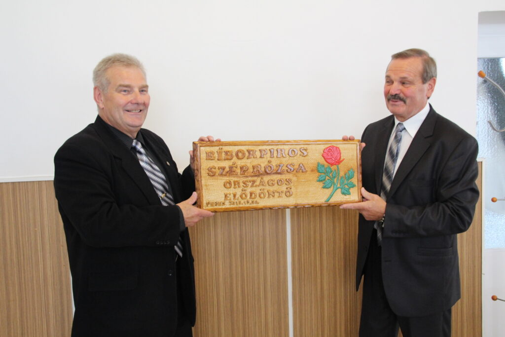 Mézes Rudolf és Borsányi Gyula a Bíborpiros szép rózsa emléktáblával.