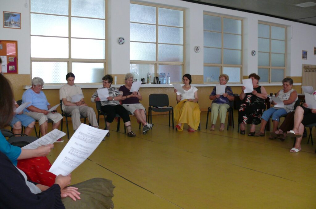 A résztvevők mátyusföldi népdalokat tanulnak.