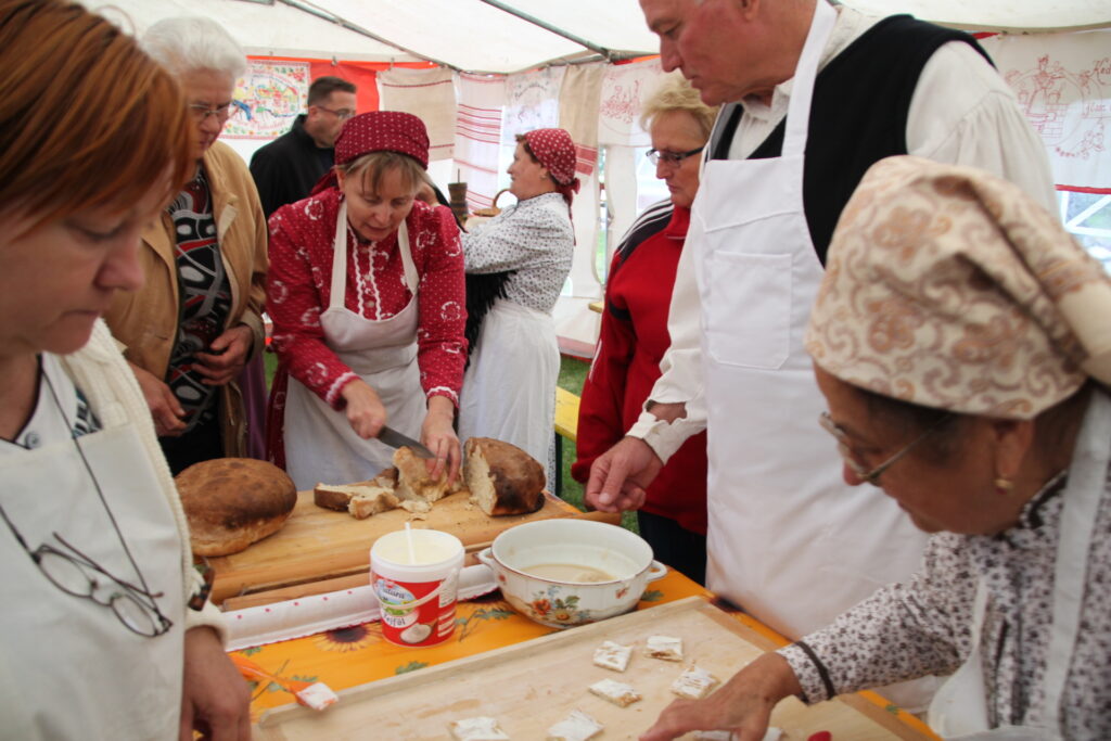 A Csemadok alapszervezetének tagjai kenyérszelés közben.
