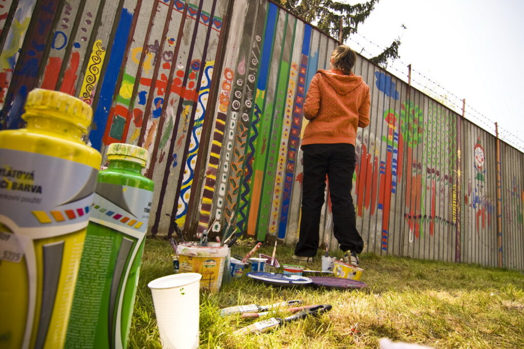 A kerítésfestést Szamaránszky Emőke vezette, aki épp mázol