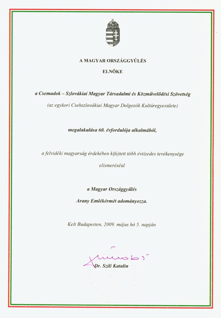 | Címke | Csemadok Művelődési Intézete / Magyar Országgyűlés Arany Emlékérmét kapta a Csemadok, 2009 |