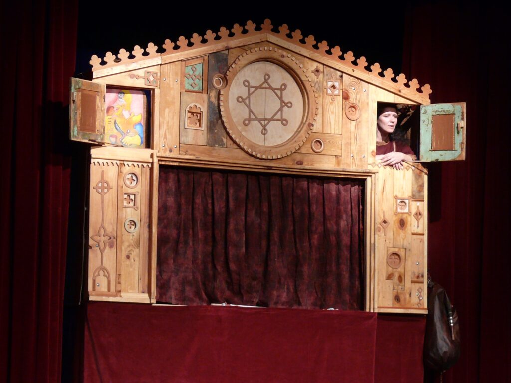 A Lánghordozó Lovag c. bábjáték a Levendulaszínház és az Évkerék Társulat előadásában. A jobb felső ablakban: Szluka Judit