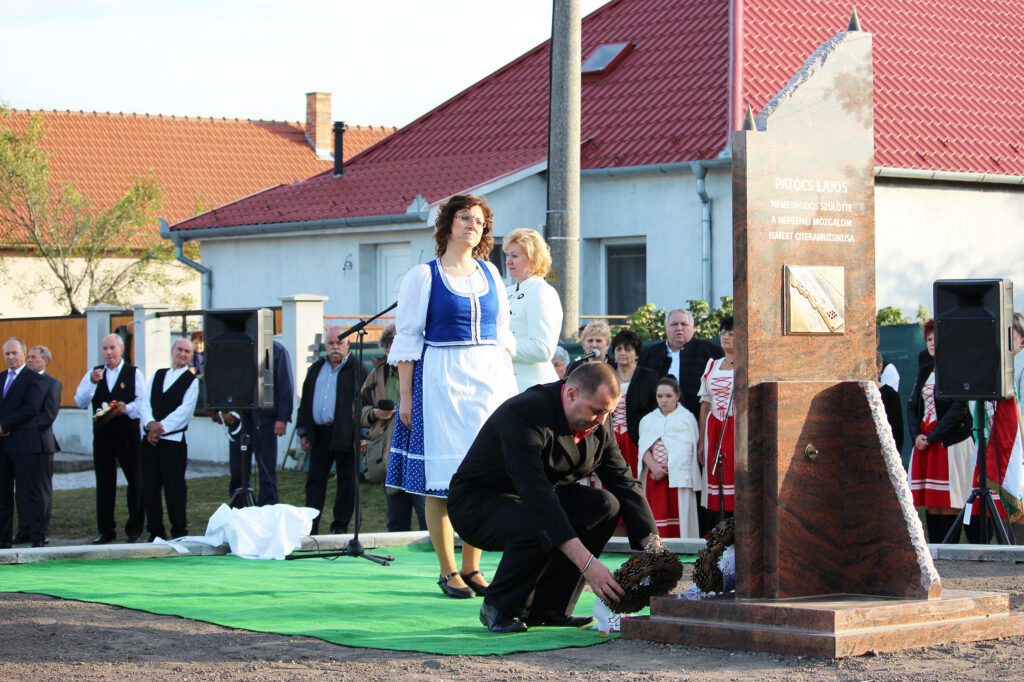 Moravek Ivett és Balogh László, a citerások nevében koszorúznak.