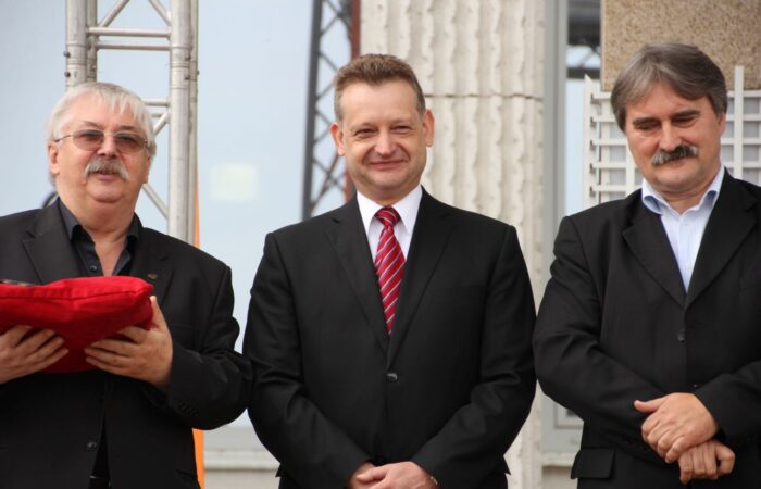 Balról: Huszár László, a Meseváros kormányzója; Hájos Zoltán, Dunaszerdahely polgármestere; Bárdos Gyula, a Csemadok országos elnökeLétrehozó: Szlovákiai Magyar Művelődési Intézet