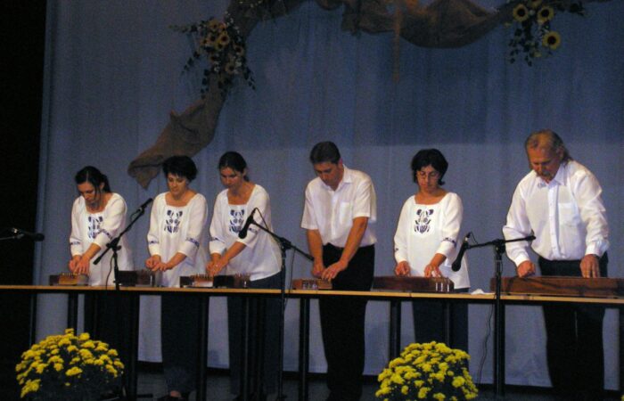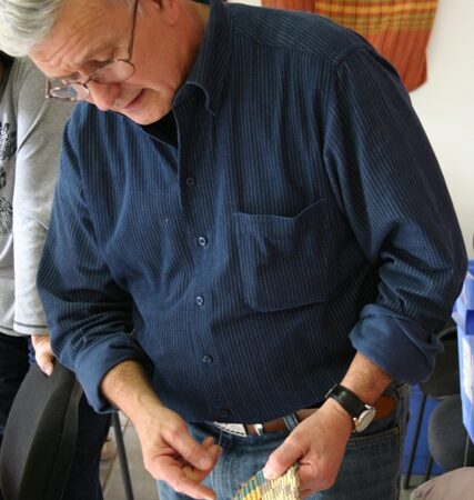 A kék ládákból kerültek elő a régi és új szőttesek, valamint a fonalak is. A képen Lőrincz Péter szövőmester látható.Szövõtábor fiataloknak és felnõtteknekLétrehozó: Huszár Ágnes