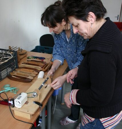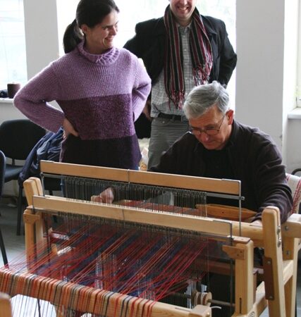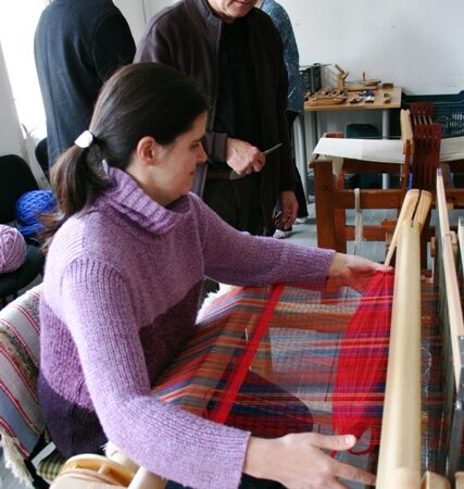 Lõrincz Péter szövõmester a régi és új szõttesekrõl mesél. A kép jobb oldalán Erzsébet és Veronika látható.Szövõtábor fiataloknak és felnõtteknekLétrehozó: Huszár Ágnes