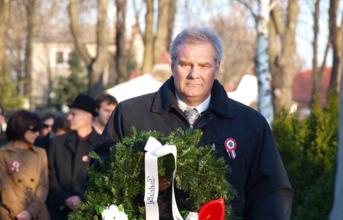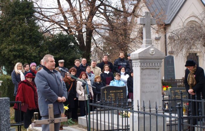 Mézes Rudolf, a Szlovákiai Magyar Szülők Szövetségének elnöke helyezi el a kegyelet virágait