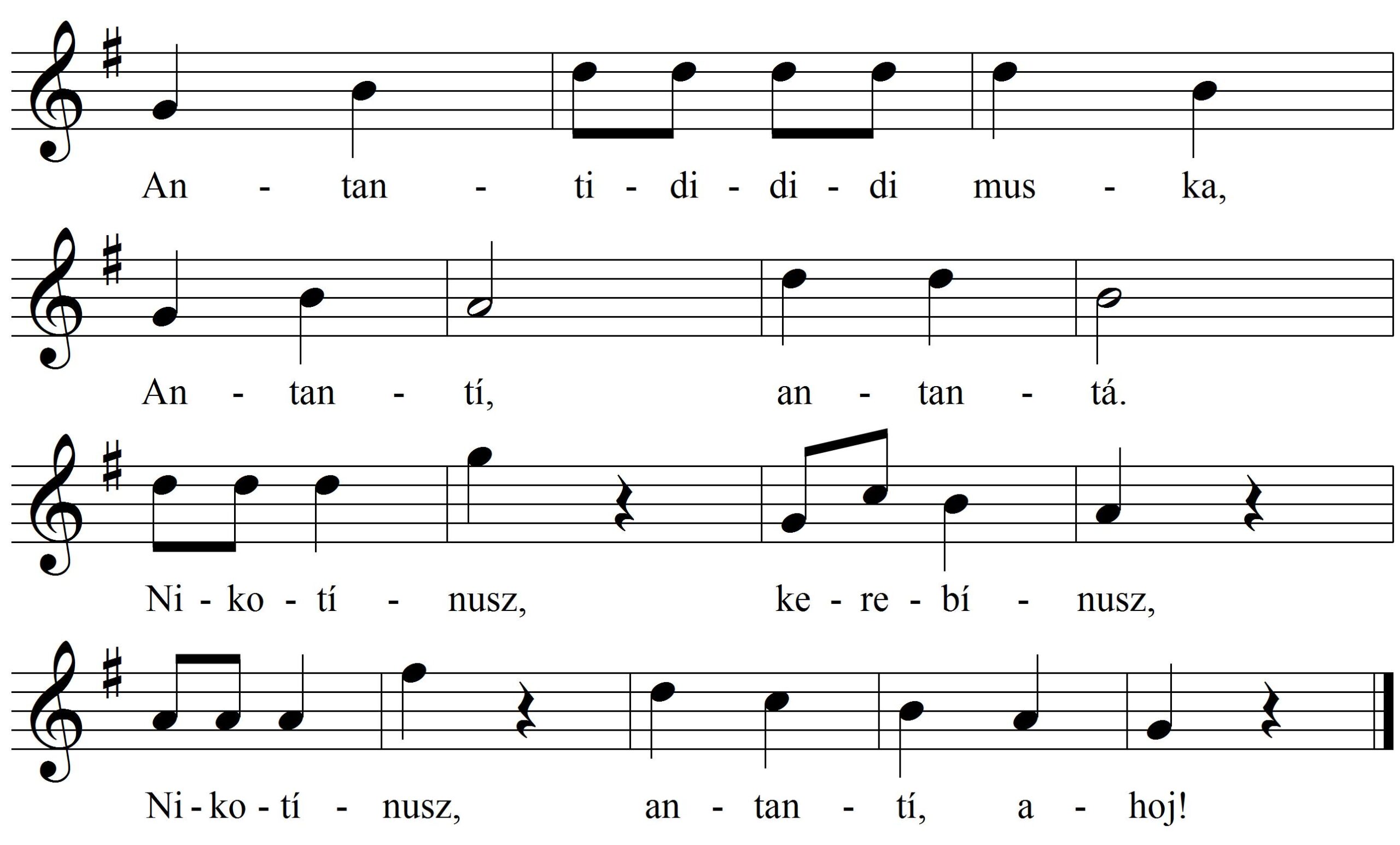 Ketten szembeállnak, s az alábbi dalt énekelve annak ritmusára (negyed értékekre) tapsolnak: