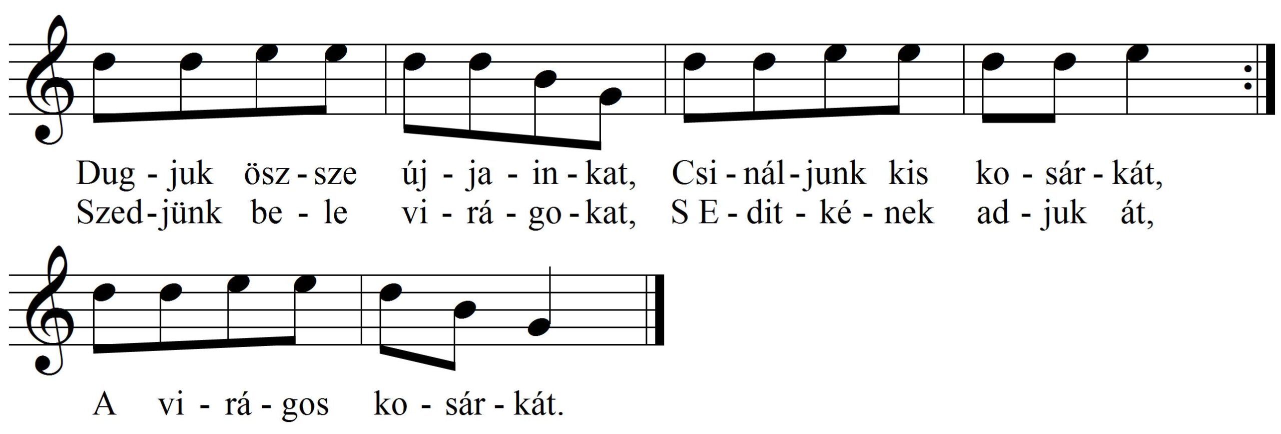 Ma már nem élő játék, a múlt század végén s századunk elején játszották. A felnőttek játéka volt a kisgyerekekkel, illetve a kisgyerekek – általában leányok – egymás közti játéka. Ketten játszották. A játszótársak egyike kezének ujjait egymásba kulcsolva tenyeréből „kosárkát“ csinált, a másik pedig virágokat szaggatott, és a kosárkába dobálta azokat. Közben az alábbi dalt énekelte: