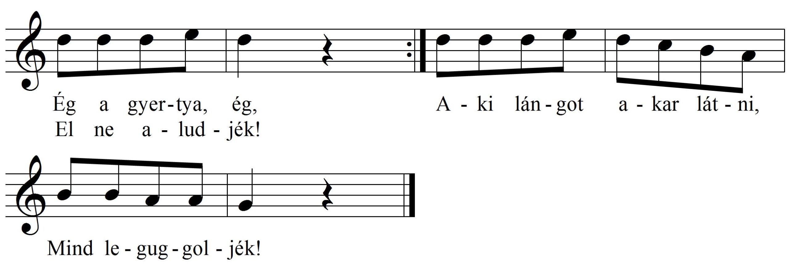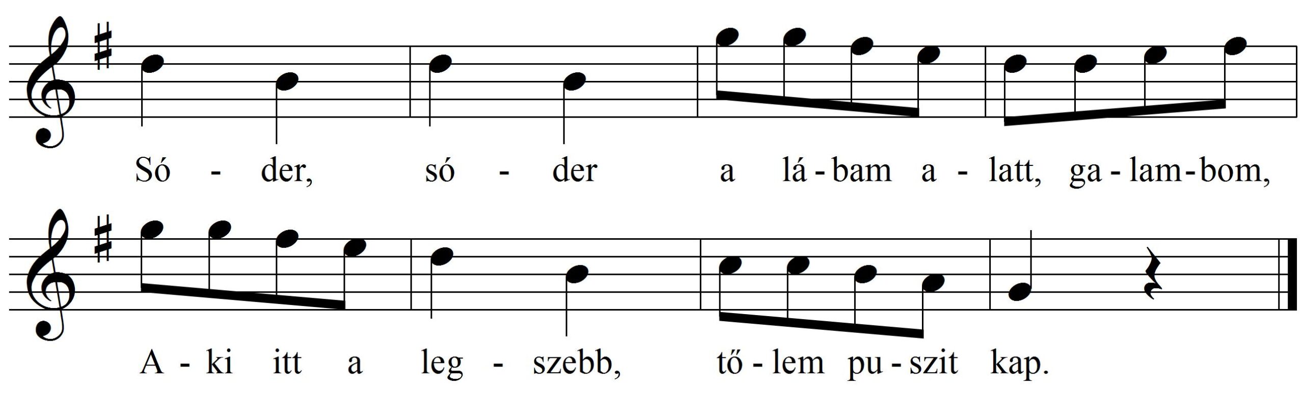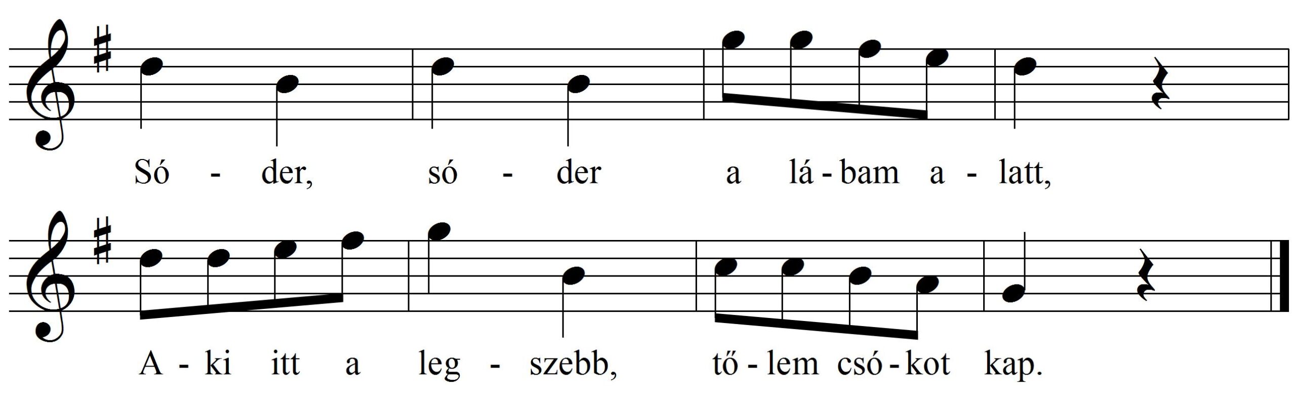 Közben a dalocska negyed értékeire a két játékos tapsol, oly módon, hogy hol a jobb kezüket ütik össze, hol a balt, s a két összeütés között külön-külön is tapsolnak egyet.