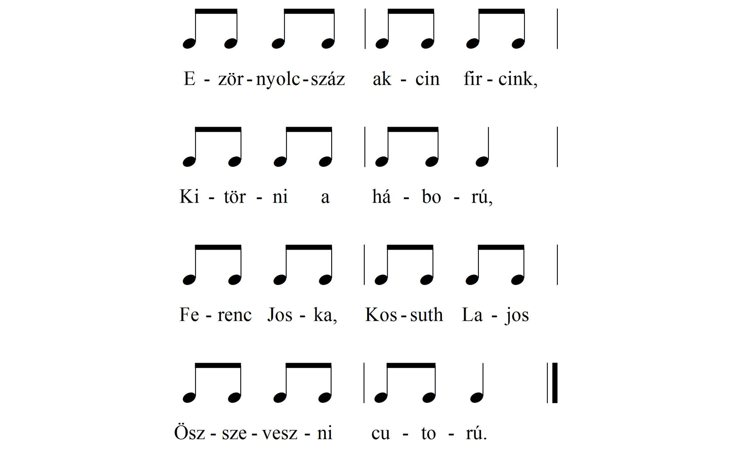 Az 1848/49-es szabadságharcra utal. Szövegében a németes kiejtést utánozza.