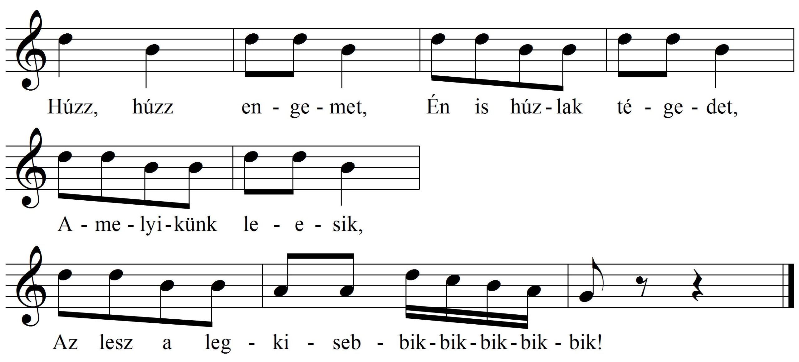 A felnőtt a kisgyermeket arccal maga felé az ölébe ülteti, s az alábbi dalocska ritmusára hol maga felé húzza, hol meg engedi a térdén hanyatt dőlni: