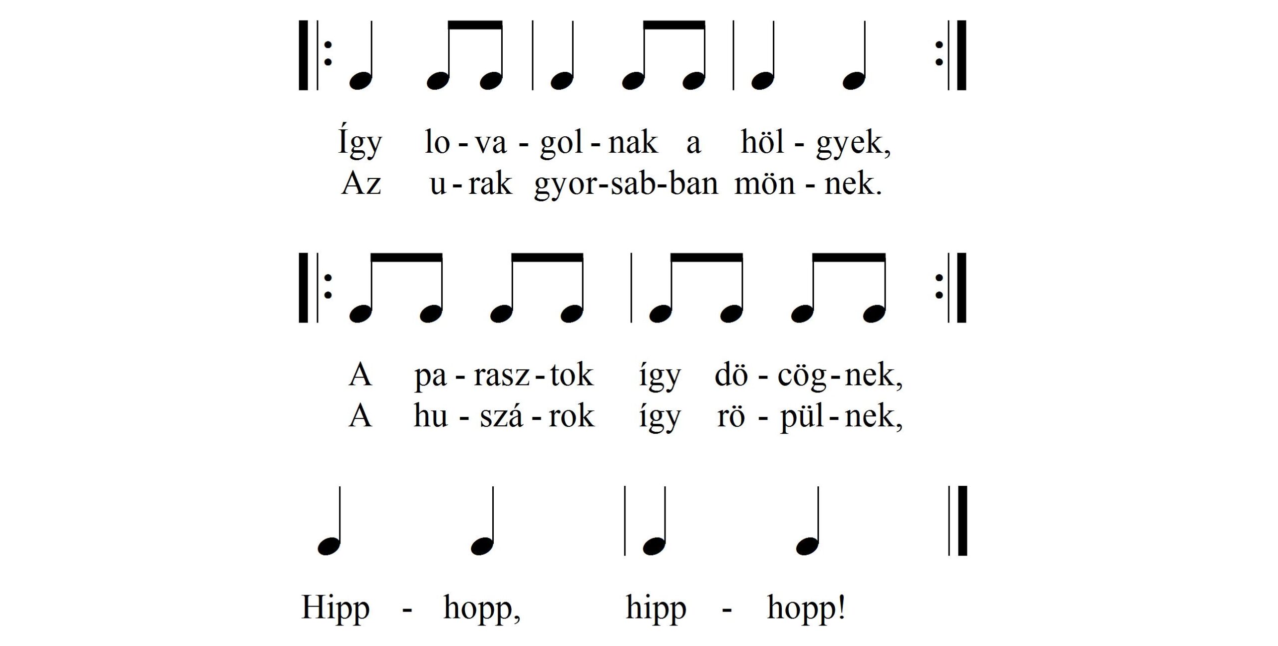 A felnőtt hóna alatt vagy felső karjánál fogva arccal maga felé a térdére ülteti a kisgyereket, majd az alábbi mondóka negyed értékeire lovagoltatja: