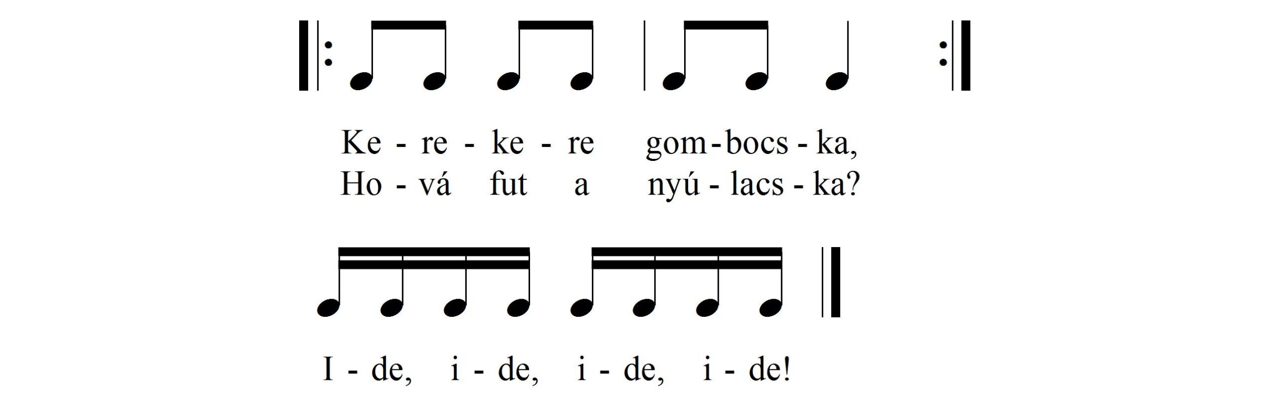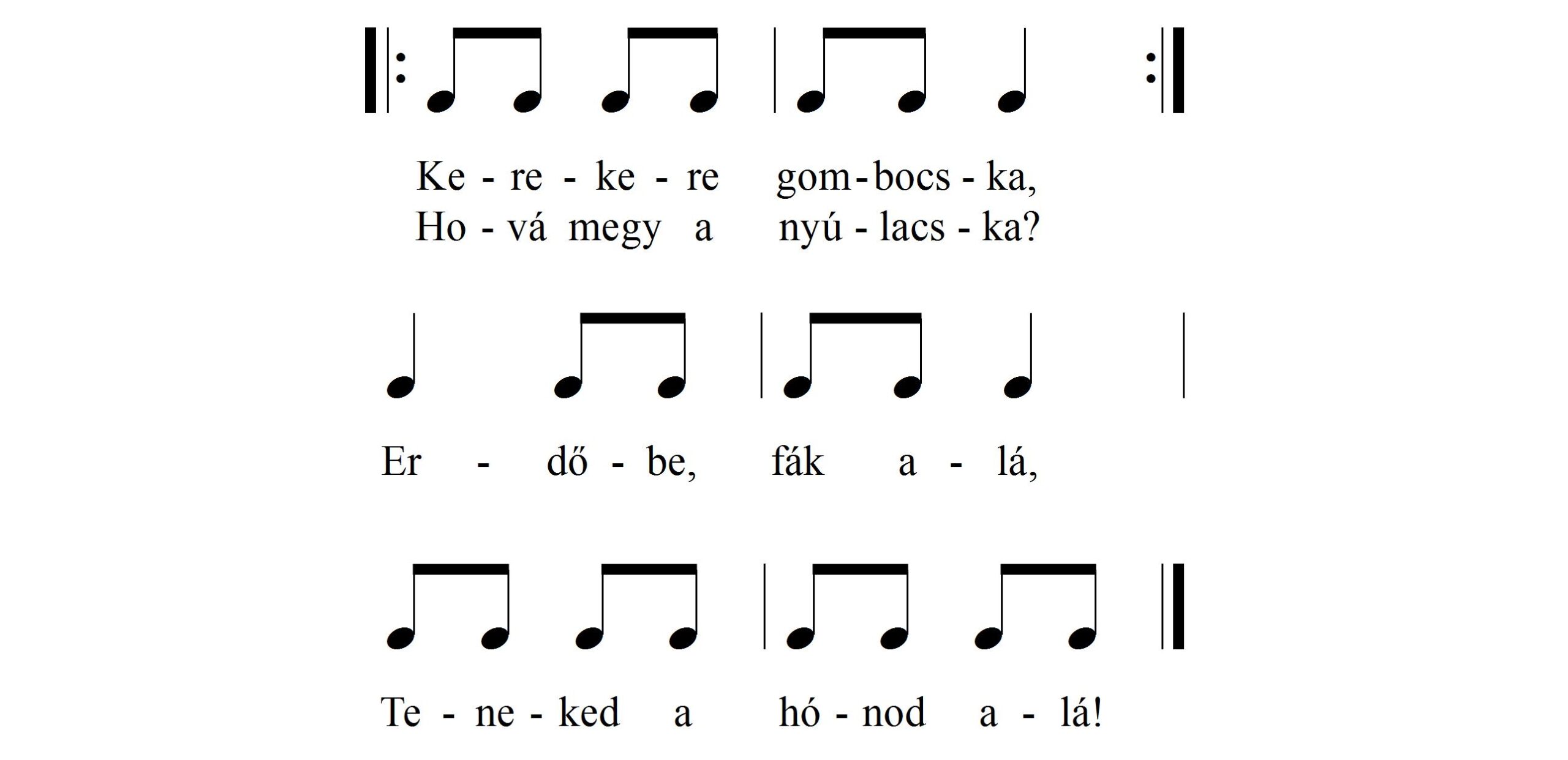 A felnőtt a kisgyermek tenyerére mutatóujjával köröket rajzol, közben az alábbi mondókát ismételgeti: