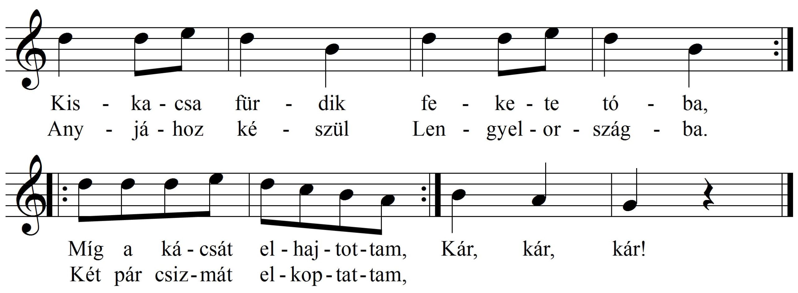 A „Kár, kár, kár!“-hoz érve a kör megáll, s a játékosok kezükkel a kacsa előtt le s fel hadonásznak.