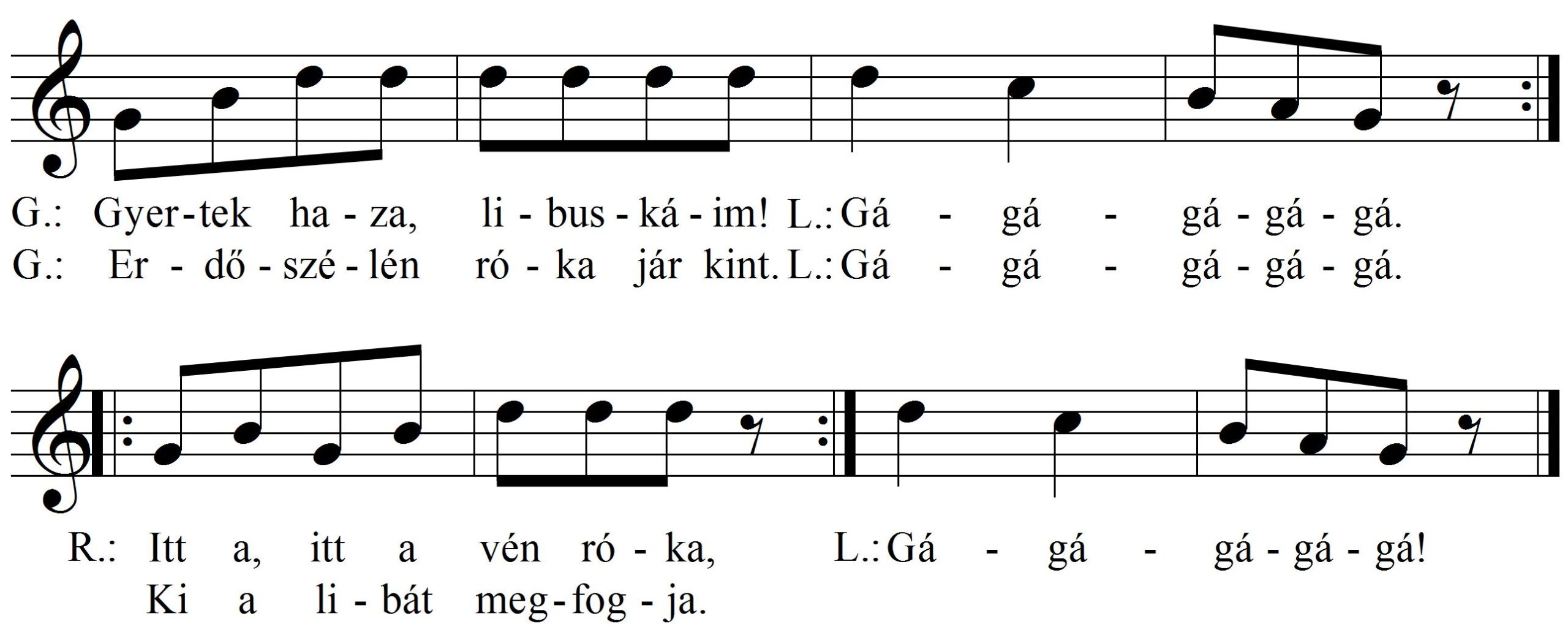„rókát“, a többiek a „libák“. A gazdasszonnyal – tőle kb. 10-15 m-re – szembeállnak a libák, a róka pedig középtájt, tőlük oldalra húzódik meg. A szétállás után a gazdasszony hívni kezdi a libákat, majd figyelmezteti őket a róka közelségére, mire a róka előugrik, hogy a gazdasszony felé futó libák közül valakit elkapjon. Közben a libák a gazdasszony felhívására mindig gágogással felelnek, a róka szavaira szintén, ám ekkor már ez a gágogás az egyre inkább fokozódó félelem érzésével telítődik meg. Az énekes párbeszéd a következő: