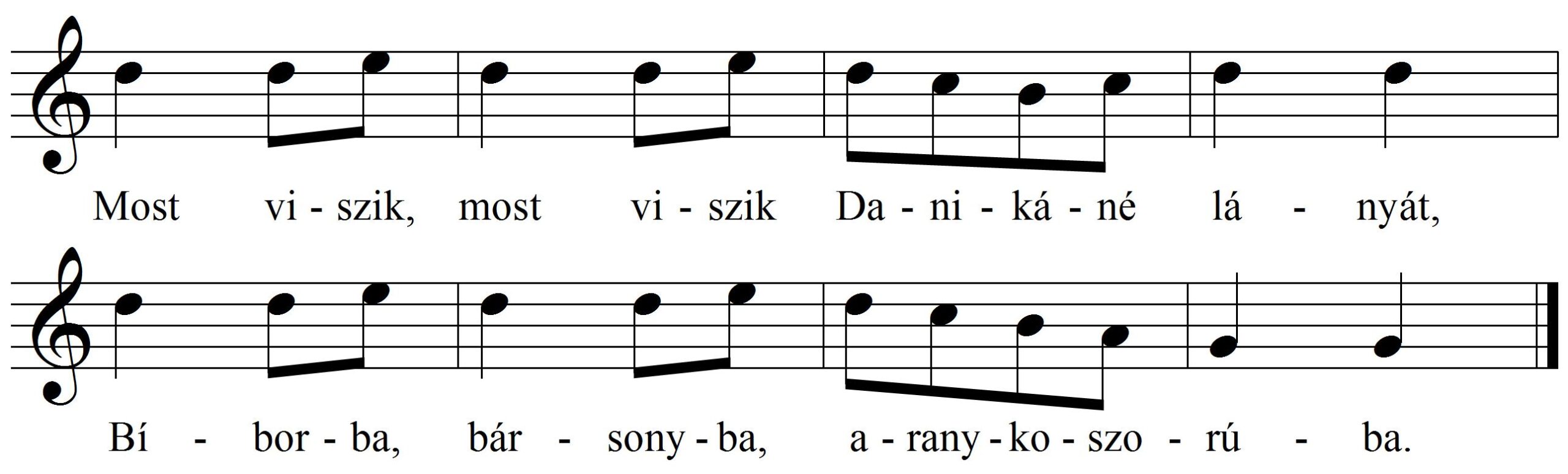 A vőlegény megfogja a leány kezét, a többiek párosával felsorakoznak mögöttük, s elindulnak. Mindnyájan éneklik a kezdő dalt: