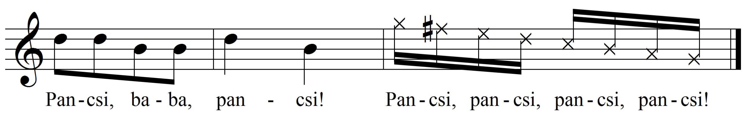 A dalocska első részében a felnőtt a kisbaba kezével negyed értékekre csapkodja a víz felszínét, a nyomatékosan kezdett és egy lélegzetvétellel mondott egyre halkuló második részben a víz csapkodása meggyorsul.