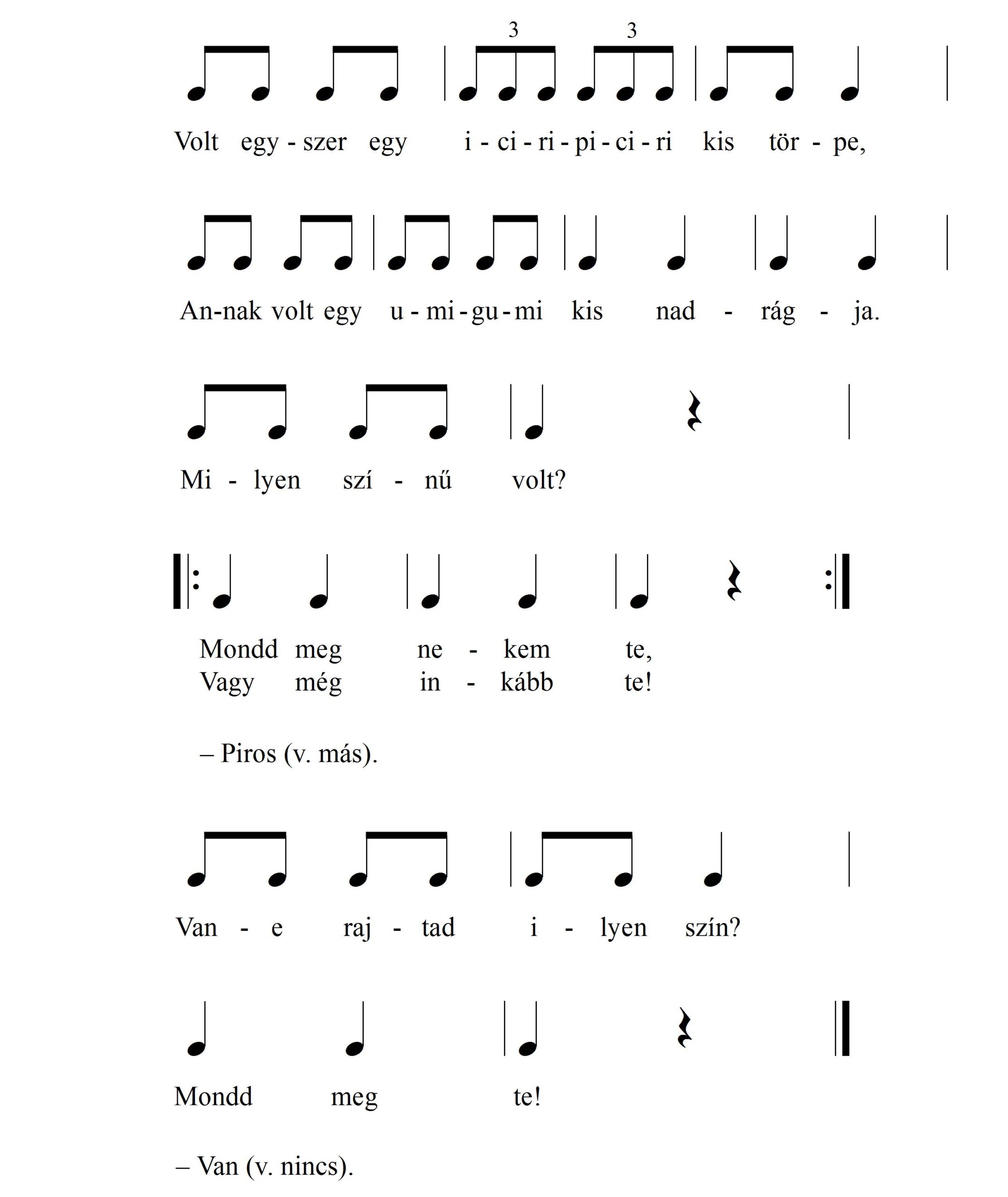 Akire az utolsó szótag jut, mond egy színt, mégpedig olyat, amilyen a saját öltözékén is található. Ezután folytatódik a kiszámolás. Akire a befejező rész utolsó szótagja jut, és ruházatán előfordul a mondott szín, kiáll a körből. Ha öltözékén nem lelhető fel a mondott szín, továbbra is a körben marad. Aki utolsónak marad bent, az lesz a fogó vagy „sunyó“. Ha a kiolvasót mondó játékos kiesik, a kiszámolást általában ő folytatja tovább, saját magát azonban kihagyja belőle.