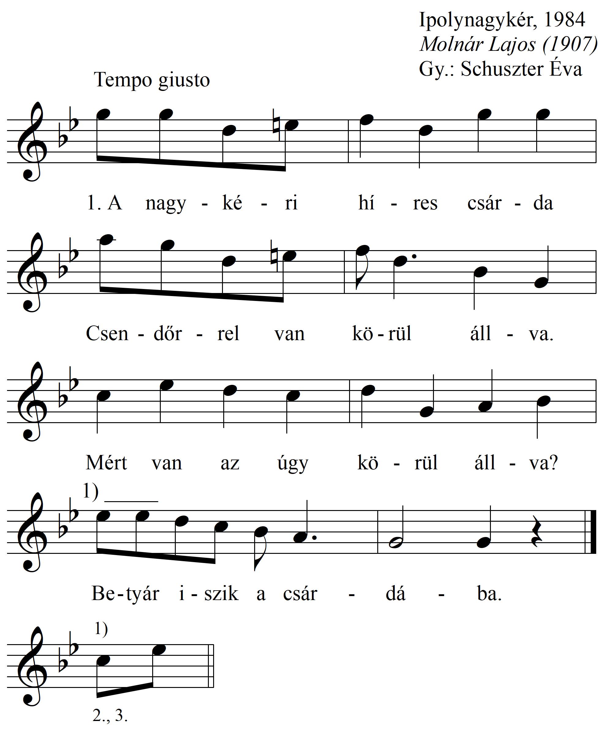 Bemëntem az udvaromba, Mit këllyet látnom, Mëg van kötve ëgy huszárló, Az udvaromon. Kérdem én a feleségëm, – Mi baj,...
