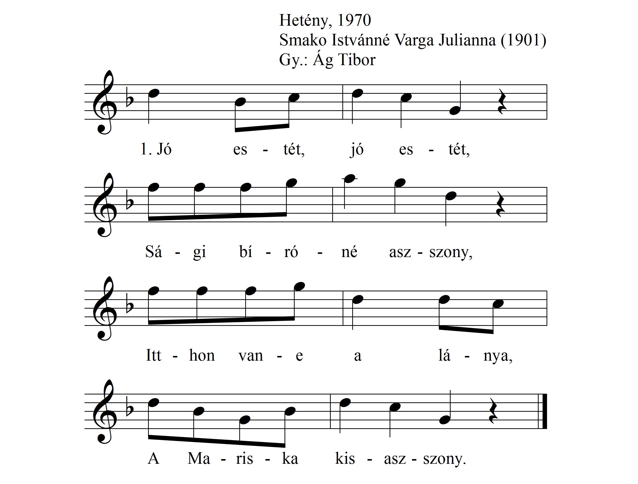 1. Jó estét, jó estét, Sági bíróné asszony, Itthon van-e a lánya, A Mariska kisasszony. 2. Itthon van, itthon van, A belső szobában....