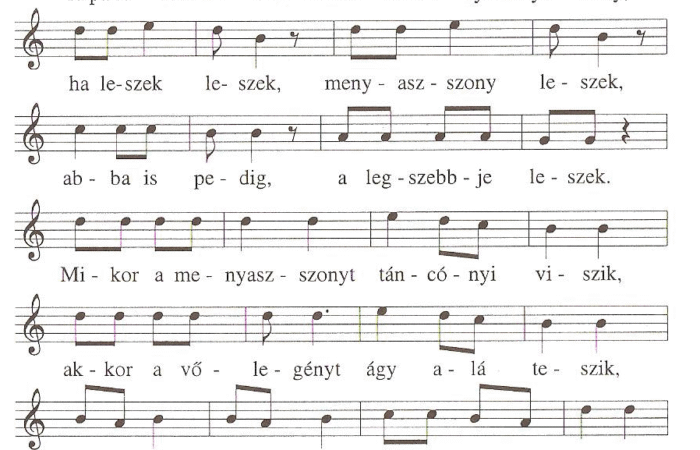 A pala deszka nem leszek többé nyoszolyó leány,Ha leszek leszek menyasszony leszek,Abba is pedig, a legszebbje leszek.Mikor a menyasszonyt táncónyi...