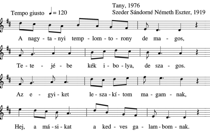 A nagytanyi templomtorony de magos, Tetejébe kék ibolya, de szagos. Az egyiket leszakítom magamnak. Hej, a másikat a kedves galambomnak....