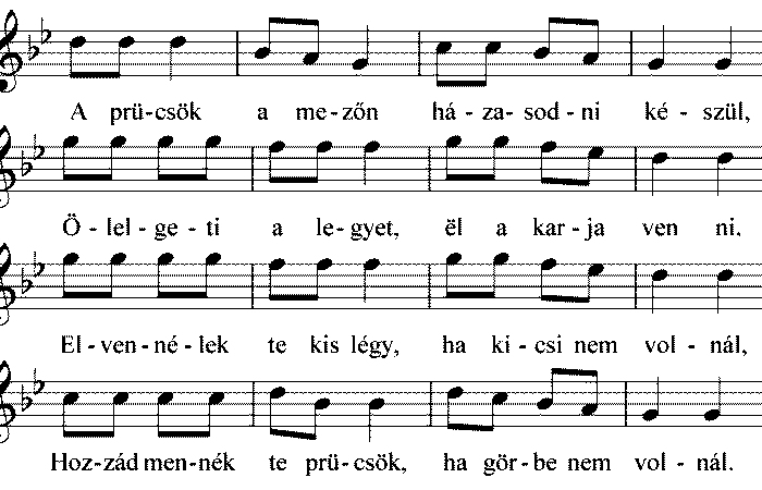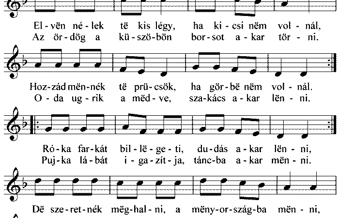 1. A prücsök a mezőn házasodni készül, Ölelgeti a legyet, ël akarja venni. Elvennélek te kis légy, ha kicsi nem...