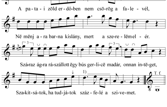 A patai zöld erdőben nem csörög a falevél, Në mënj arra barna kislány, mert a szerelëmel ér. Száraz  ágra szállott ëgy bús...