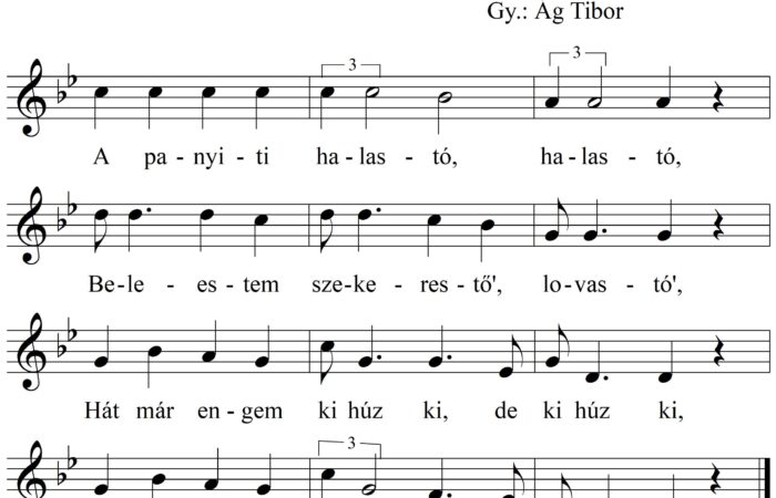 A panyiti halastó, halastó, Beleestem szekerestő’, lovastó’, Hát már engem ki húz ki, de ki húz ki, Gyenge a szeretőm...
