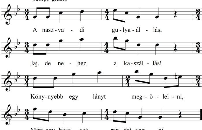 1. A naszvadi gulyaállás Jaj, de nehéz a kaszállás! Könnyebb egy lányt megölelni, Mint egy hosszú rendet vágni. 2. Nyitra...