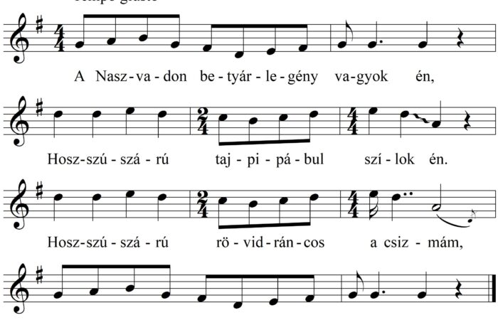 1. A Naszvadon betyárlegény vagyok én, Hsszúszárú tajpipábul szílok én. Hsszúszárú rövidráncos a csizmám, A naszvadi bíró lányo a babám.