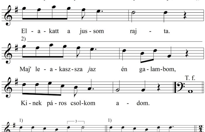 1. A pozsonyi kettős torony alja, hogy Elakatt a jussom rajta. Maj’ leakaszza jaz én galambom, Kinek páros csolkom adom....