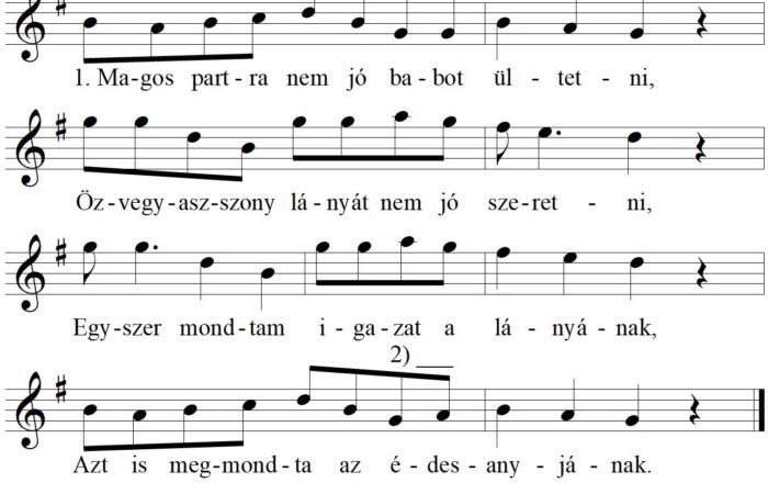 1. Magos partra nem jó babot ültetni, Özvegyasszony lányát nem jó szeretni, Egyszer mondtam igazat a lányának, Azt is megmondta...