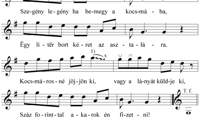 1. Szegény legény ha bemegy a kocsmába, Ëgy litër bort kéret az asztalára. Kocsmárosné jöjjön ki, vagy a lányát küldje ki, Száz...