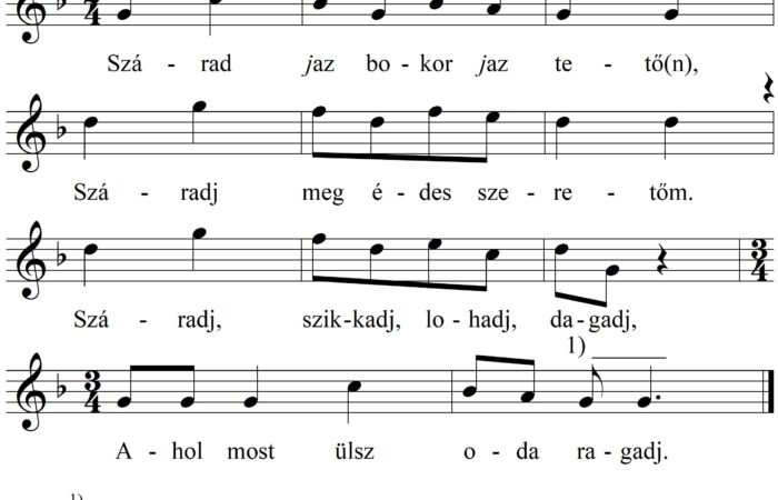1. Száraz földbe csitteg-csattog az eke, Gyáva legény, kinek nincs szeretője. Madárnak is van a sűrű erdőbe’, Nékem is van...