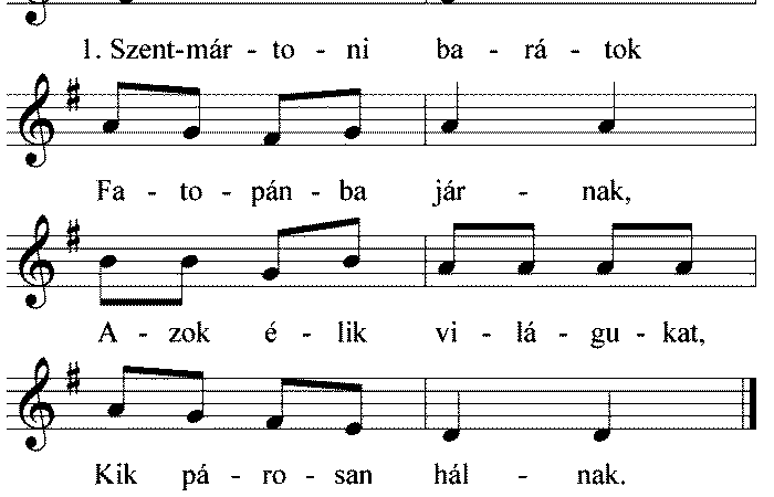 1. Szentmártoni barátok Fatopánba járnak, Azok élik világukat, Kik párosan hálnak. 2. Lám én szegény vándorlegény Csak egyedül hálok, Akármerre...