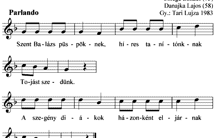 1. Szent Balázs püspöknek, Híres tanítónknak Tojást szëdünk. A szëgény diákok Házonként eljárnak Kérelëmmel. 2. Vándormadarak is A szép kikeletkor Mind...